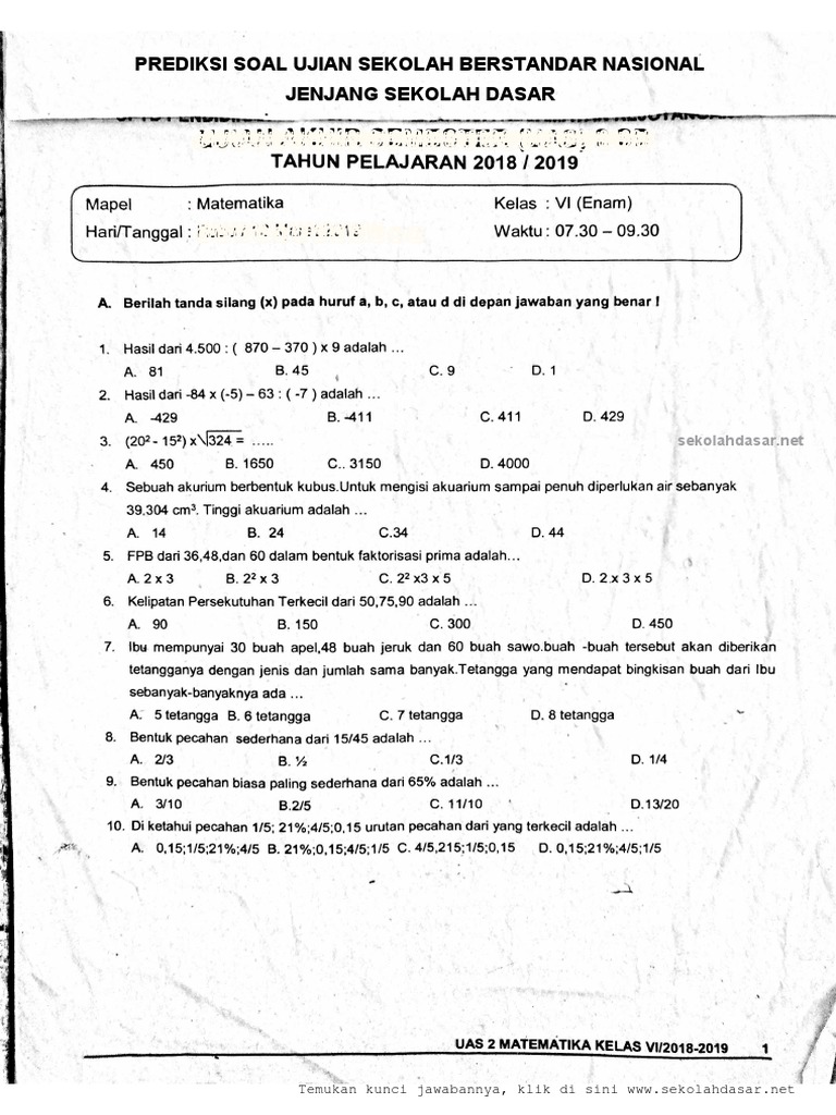 Contoh Soal Matematika Kelas 6 Sd Semester 2 2019
