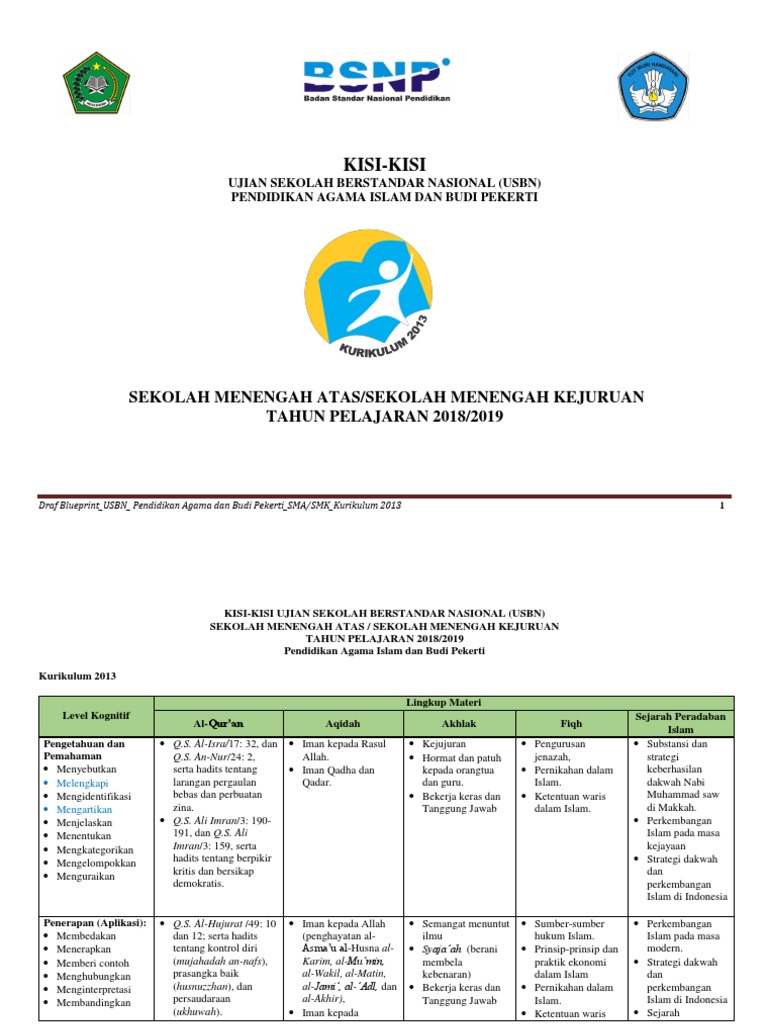 01 K 13 Kisi Kisi Usbn Pai Sma Smk 2018 Blueprint 1 Pdf