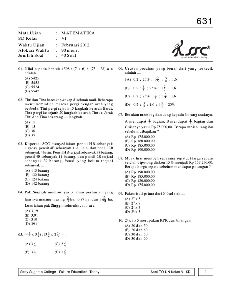 98525012 Soal To Uasbn Matematika Kelas 6 Sd Kode 631 Pdf