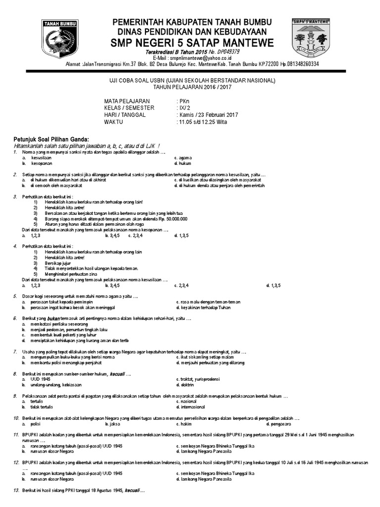 Soal Usbn Smp Pkn 2017 Dan Kunci Jawaban Lengkap