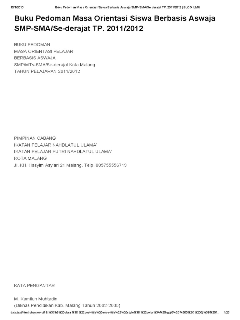 Buku Pedoman Masa Orientasi Siswa Berbasis Aswaja Smp Sma Se