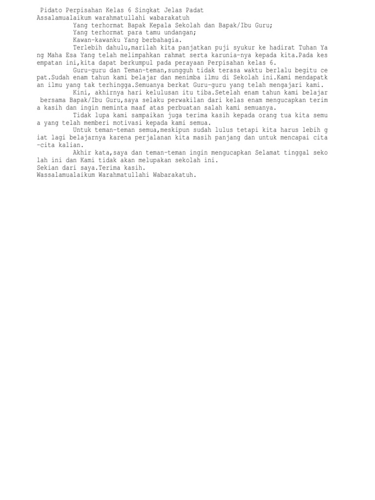 Pidato perpisahan kelas 6 singkat jelas padatassalamualaikum warahmatullahi wabarakatuhyang terhormat bapak kepala sekolah dan bapakibu guruyang terhormat. Contoh pidato singkat perpisahan kelas 6 dan 9. Tidak perlu berpatokan pada teks pidato diatas silahkan kembangkan dan revisi sesuai dengan kebutuhan kamu.