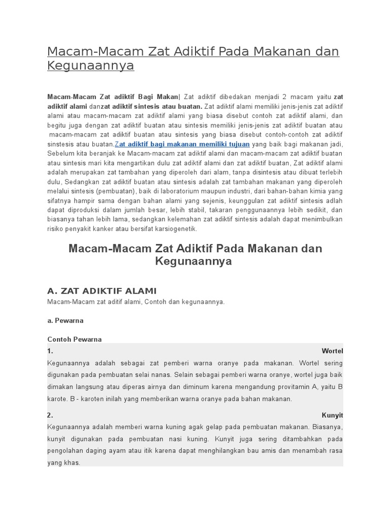 Selain sebagai pemberi warna oranye wortel juga baik dimakan langsung atau diperas airnya dan diminum karena mengandung provitamin a yaitu b karote. Begitu banyak zat aditif pada makanan yang saat ini digunakan para produsen pada setiap produknya. Zat zat kimia yang ditambahkan ke dalam makanan untuk meningkatkan kualitasnya yang mencakup rasa penampilan warna keawetan dan lain lain disebut zat aditif makanan.
