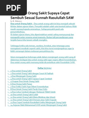 Doa lekas sembuh rasulullah ketika menjenguk orang sakit dalam hadist riwayat abu dawud attimidzi dan alhakim disebutkan bahwa ibnu abbas ra pernah mendengar rasulullah saw bersabda bahwa barang siapa yang menjenguk orang sakit sebelum tiba ajal baginya bacakanlah doa ini sebanyak 7 kali supaya allah menyembuhkan ia dai penyakit tersebut. Ada beberapa versi doa untuk orang sakit yang dapat kita baca sesuai dengan kondisi atau keadaan orang sakit yang kita jengukdoa doa berikut ini sangat baik dibacakan agar si sakit bisa segera sembuh dan memulai harinya yang normal kembali. Di dalam beberapa riwayat hadis seperti hadits riwayat attimidzi abu dawud dan alhakim disebutkan bahwa ibnu abbas ra pernah mendengar rasulullah saw berbsabda bahwa barangsiapa yang menjenguk orang sakit sebelum ajal tiba baginya hendaknya bacakanlah doa ini sebanyak 7 kali agar allah menyembuhkan penyakitnya.