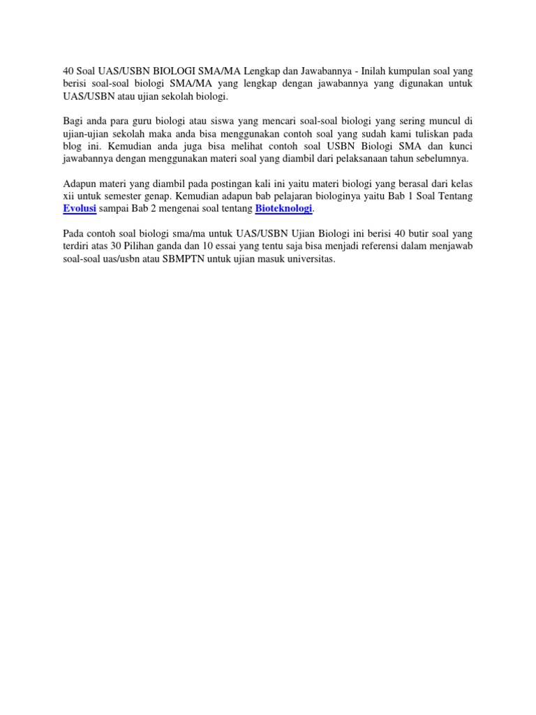 Contoh soal usbn sma biologi. Soal soal usbn biologi sma dan kunci jawabannya tulisan ini berisikan materi soal tahun sebelumnya tentunya ini bisa dijadikan referensi sebagai sarana pembelajaran dalam menghadapi usbn biologi di tahun ini. Cek juga paket pelajaran dari bimbel online zenius education. Untuk mendukung upaya tersebut selain itu diperlukan pembahasan soal latihan un biologi.
