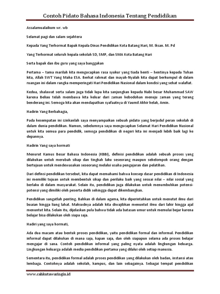 Contoh pidato singkat tentang pendidikan pendidikan merupakan suatu kebutuhan pokok untuk seluruh manusia entah itu pendidikan formal maupun nonformal. Contoh pidato singkat bahasa indonesia kumpulan naskah contoh teks pidato singkat tentang pendidikan perpisahan di sekolah dan kampus pidato narkoba pergaulan bebas agama serta contoh pidato dalam bahasa inggris untuk anak sd dan tk. Pidato resmi ini bisa disampaikan oleh presiden menteri maupun.