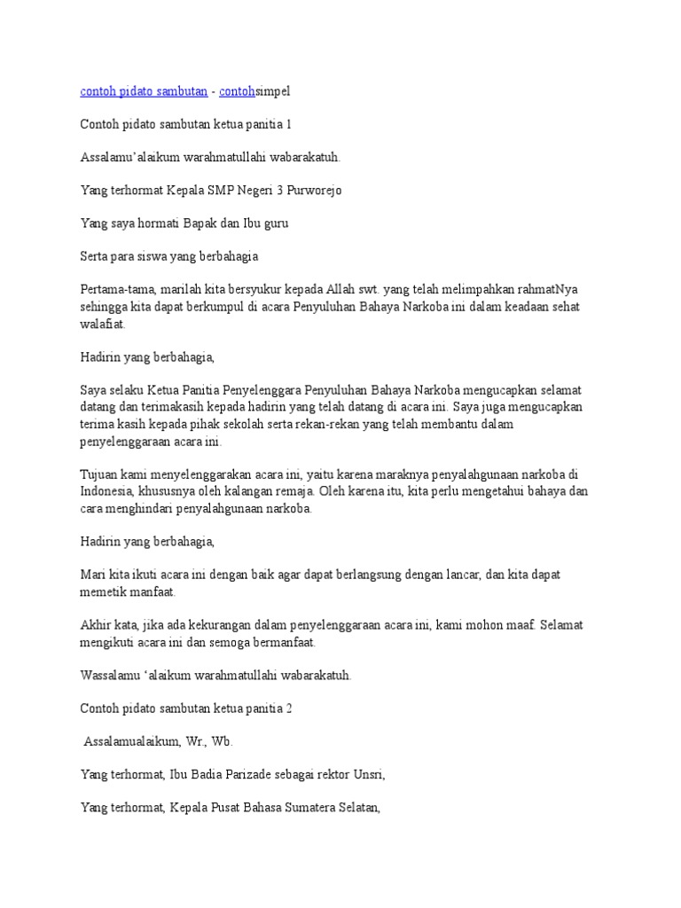 Contoh teks pidato sambutan dalam sesuatu kegiatan bisanya seorang ketua panitia penyelenggara kegiatan haruslah memberi pidato sambutan atau laporan ketua panitia yang disampaikan secara tertulis maupun secara lisan dalam menyambut suatu acara atau kegiatan yang akan dilaksanakan. Kabupaten padang lawas. Contoh sambutan ketua panitia.