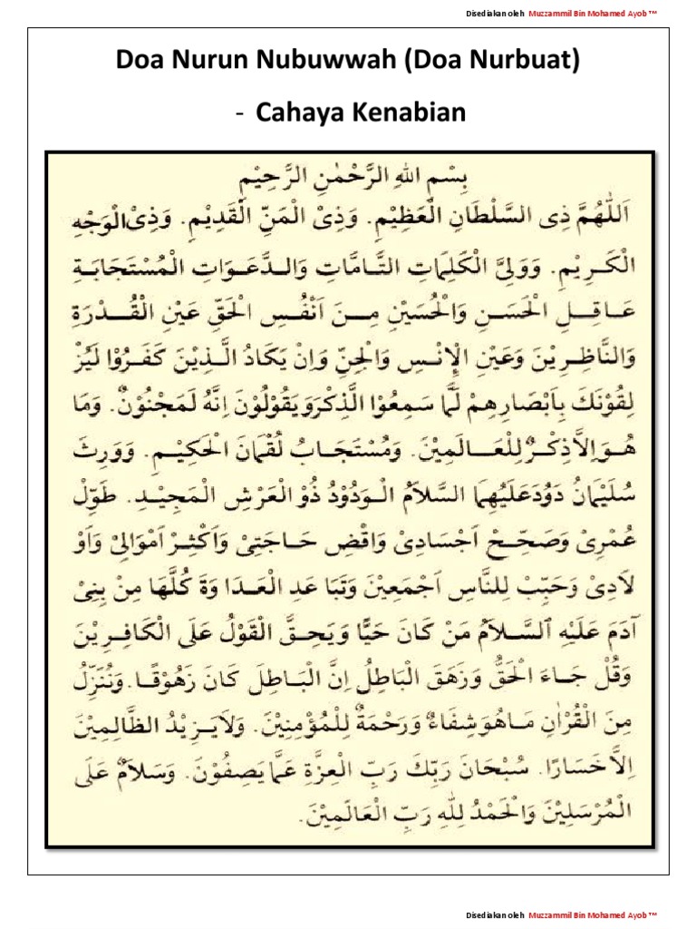 Doa nurbuat agung. Ya allah robb yang memiliki kekuatan yang agung yang memiliki kemauan yang abadi dan yang memiliki wajah yang mulia dan sebagai pelindung kalimat kalimat nya serta pengabul doa doa kecerdasan hasan dan husein dari jiwa yang benar pelindung indra mereka yang melihat serta indra jin dan manusia. Kemudian datanglah malaikat jibril seraya berkata. Doa nurbuat doa nurbuat atau sering juga disebut doa nubuwwah adalah salah satu doa yang memiliki banyak manfaatnya.