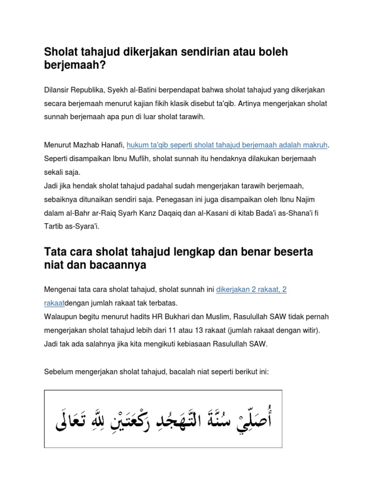 Niat sholat tahajud pengertian sholat sunah tahajud sendiri adalah sholat sunah yg dikerjakan pd waktu malam sedikitnya 2 dua rakaat dan sebanyak banyaknya tidak ada batasan karena sholat malam tahajud termasuk ibadah sunnah dan amalan kebaikan sehingga tidak ada batasannya hanya saja disetiap 2 rakaat sholat sunnah malam tahajud terdapat 1 salam didalamnya. Tentu saja karena sholat tahajud dan sholat tarawih merupakan sholat malam sedangkan sholat witir adalah penutupnya. Silahkan anda baca berulang ulang kali kalau bisa sampai 100 kali dalam membacanya agar cepat hafal dan bisa diingat di dalam hati kamu.