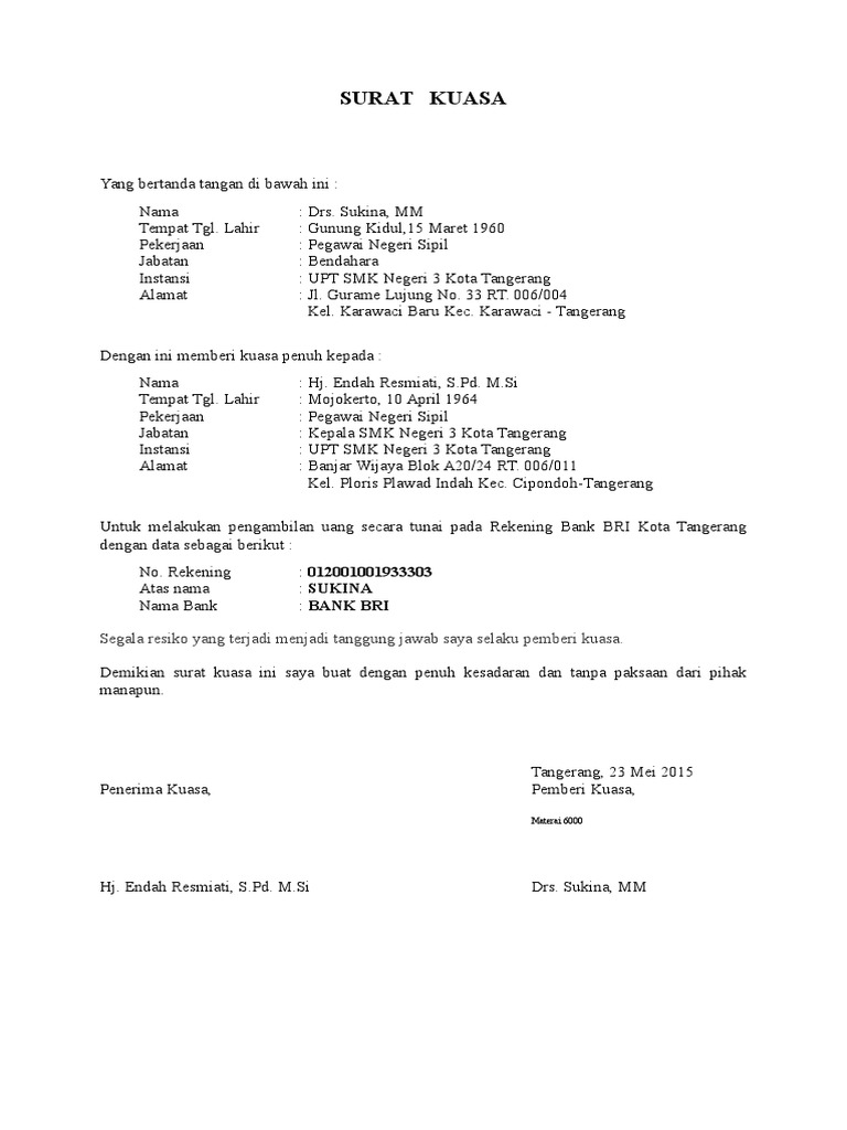 Pengambilan uang pensiun melalui surat kuasa tersebut harus di bank tempat membuka rekening tabungan pensiun. Atau surat kuasa penjualan tanah? Terkadang tidak semua keperluan akan suatu hal bisa diambil dengan mudah tanpa pemilik asli. Demikian penjelasan mengenai contoh surat kuasa. Pengiriman uang sekarang ini sudah sangat. Surat kuasa pengambilan uang di bank adalah surat yang dibuat oleh seseorang untuk memberikan wewenang kepda orang lain untuk dapat mengambil uangnya yang disimpan di bank. Banyak contoh surat kuasa yang ada di internet, tetapi tidak semuanya sesuai dengan pedoman contohnya: Untuk memberikan kuasa mengambil uang di bank bca kepada orang lain, kamu harus mencantumkan informasi jelas. Ada sedikit saran sih kalo bisa surat kuasa ini kita berikan. Demikian surat kuasa ini saya buat dengan kesadaran penuh dan tanpa ada paksaan dari pihak manapun dan semoga dapat digunakan sebagaimana mestinya. Jika anda sedang sibuk dan membutuhkan wakil atau oarang kepercayaan anda untuk mengabil uang, anda bisa menggunakan contoh surat diatas. Pada prinsipnya, surat kuasa pengambilan uang di bank sama seperti surat kuasa lainnya. Contoh surat kuasa bank bri, bca, btn, bni contoh surat kuasa bank untuk mengambil warisan.